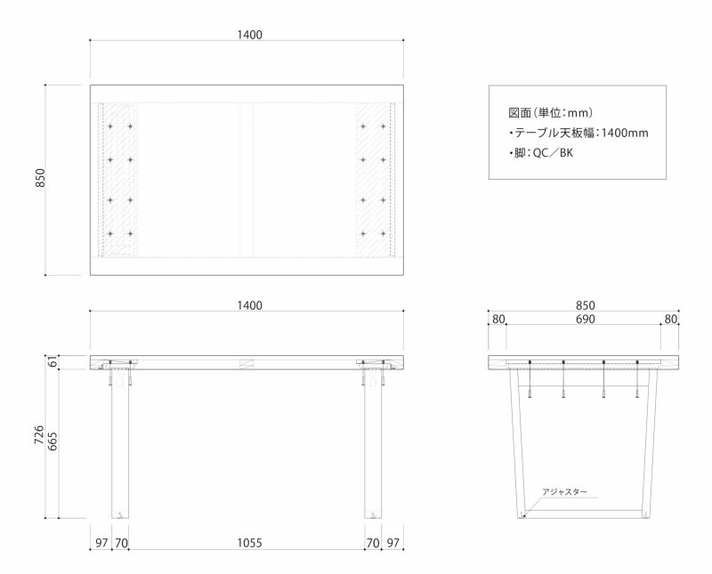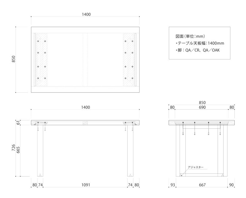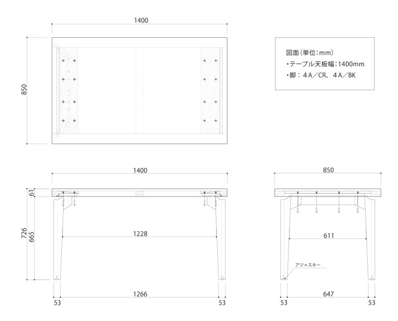 ≪ 幅140テーブル 脚QA/CR、QA/OAK 商品図面 ≫ ≪ 幅140テーブル 脚QC/BK 商品図面 ≫ ≪ 幅140テーブル 脚4A/CR、4A/BK 商品図面 ≫