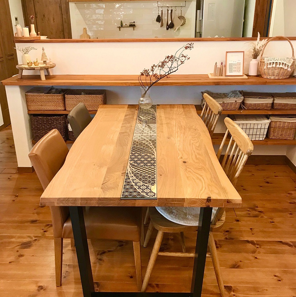 一枚板風に仕上げたテーブルの中央に、和モダンデザインの組子風板と厳選したデザインガラスをあしらった、無垢の耳付きテーブル。憩と癒しのひとときに、天然木のぬくもりと異素材のスパイスをプラス。インテリアをワンランク格上げするアイテムへと仕上げます。