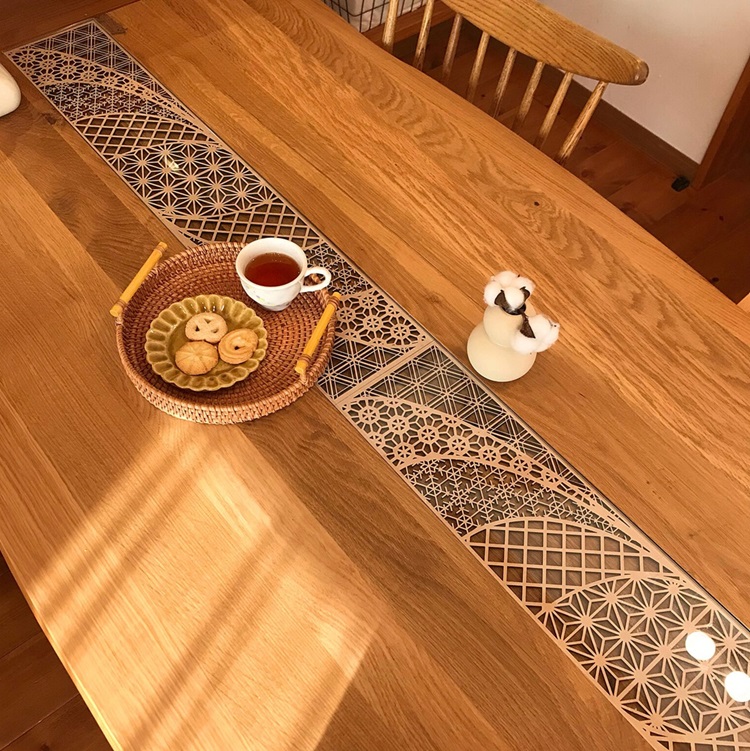 一枚板風に仕上げたテーブルの中央をくりぬき、和モダンデザインの組子風板と厳選したデザインガラスをはめ込みます。