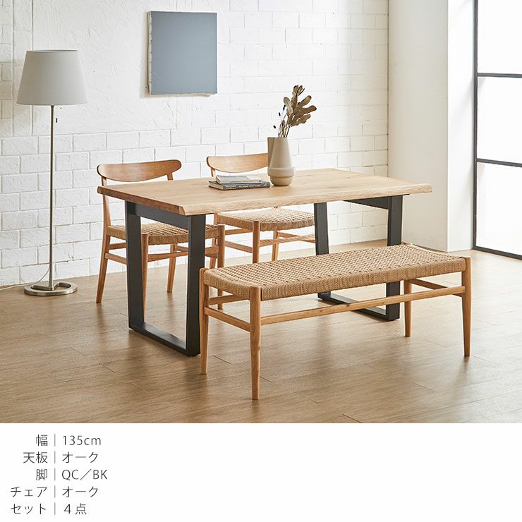 サイズ:幅135cm、天板:オーク、脚:QC/PB、チェア・ベンチ:オーク