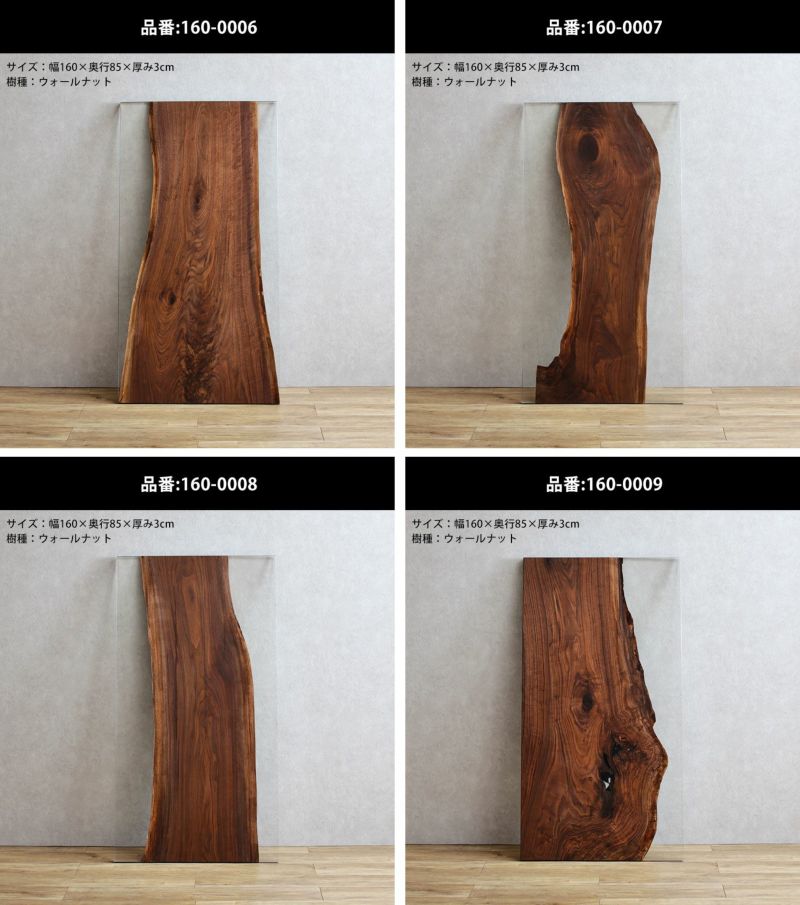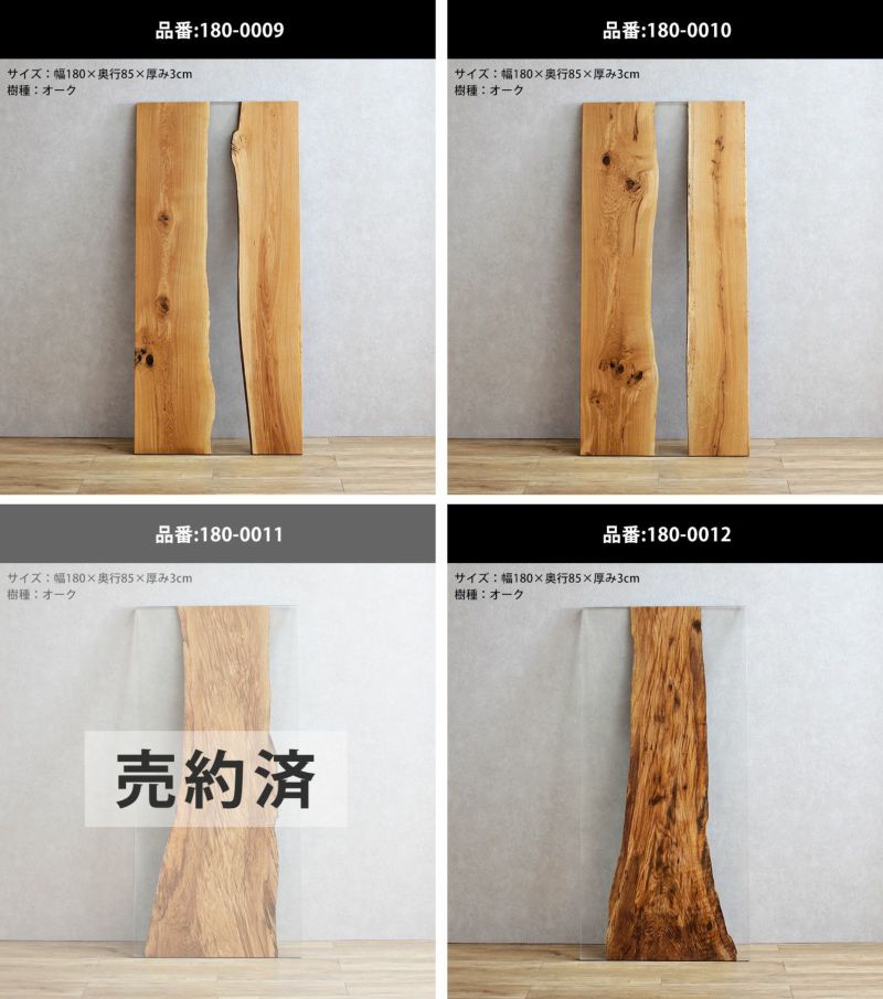 無垢特有の割れや節などの形状そのままに、木のリアルな表情を堪能できます。色も模様も雰囲気も、それぞれ個性を持った一点もの。お好みの一点ものをお選びください。