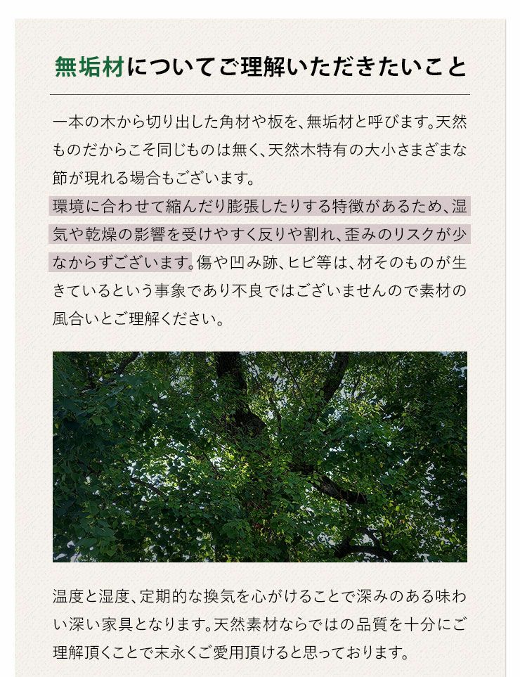 無垢材ですので使用中にヒビや割れが発生することがあります。無垢材の特徴をよくご理解・ご納得された上でご購入ください。