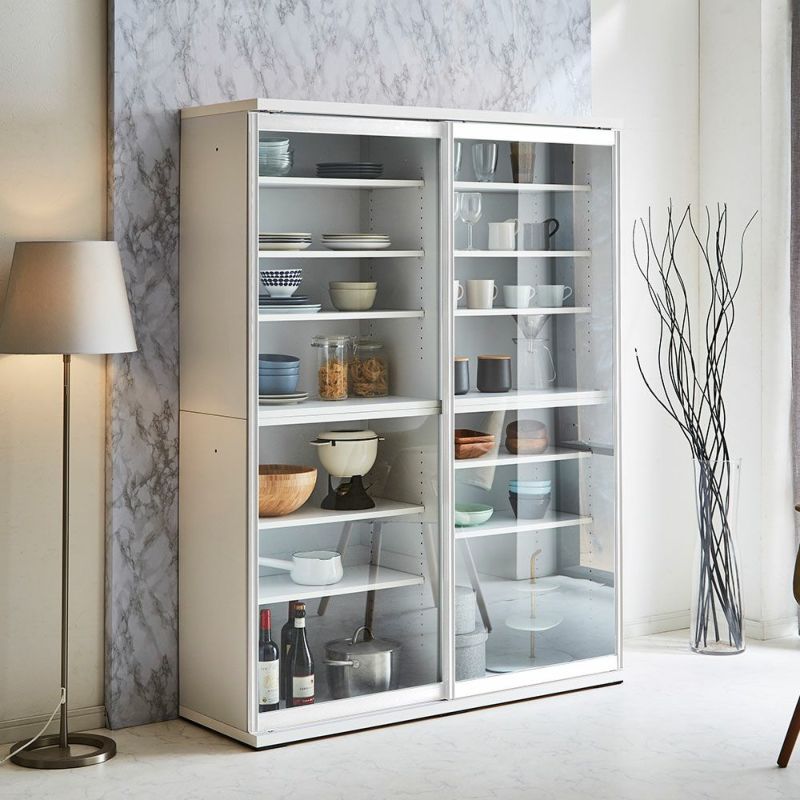 中はたっぷり収納できる大容量で、10枚の棚板を高さ3cm間隔で自由に設定して頂けます。効率よく収納できるので、コップにお皿、調理器具まで沢山収納する事ができます!さらに棚がズレ落ちにくいL型受け具の採用で軽度の耐震対策になっております。