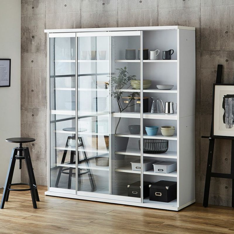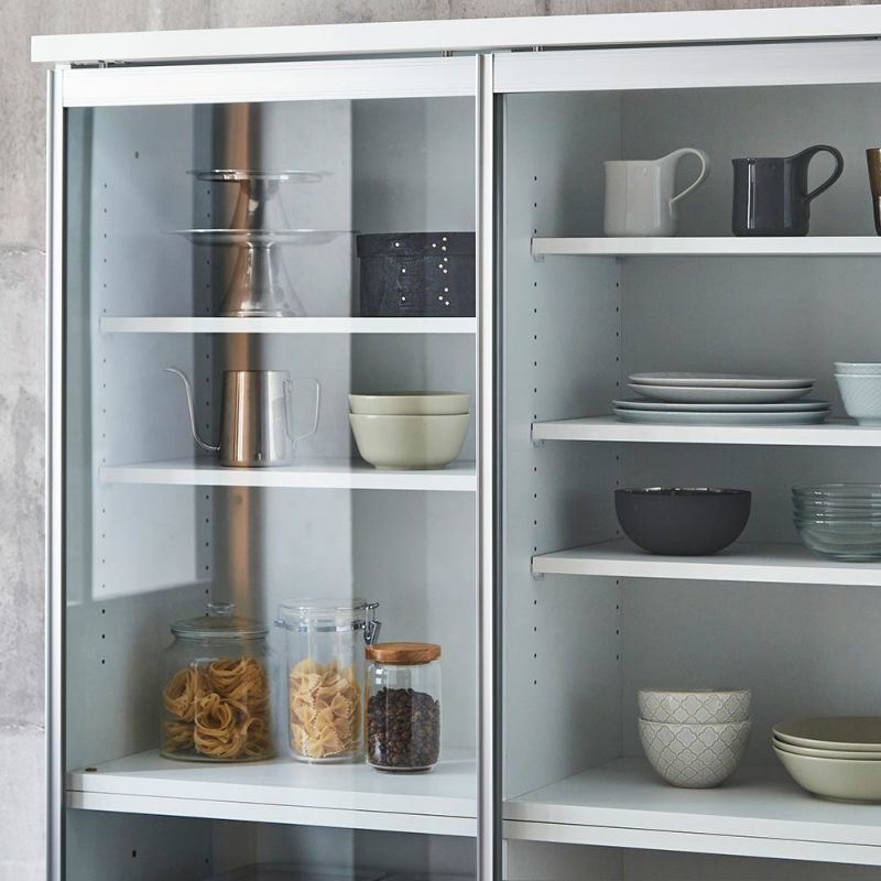 中はたっぷり収納できる大容量で、10枚の棚板を高さ3cm間隔で自由に設定して頂けます。効率よく収納できるので、コップにお皿、調理器具まで沢山収納する事ができます!さらに棚がズレ落ちにくいL型受け具の採用で軽度の耐震対策になっております。