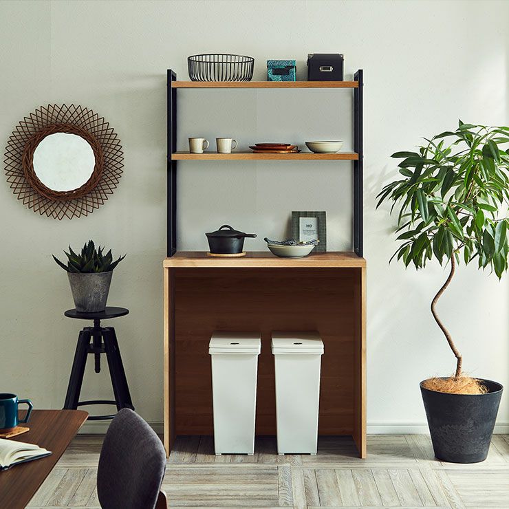 上には食器や家電を収納し、下にはゴミ箱がきれいに収まる。空間を無駄なく活用します。