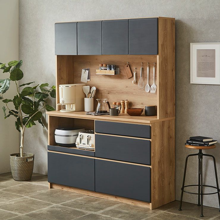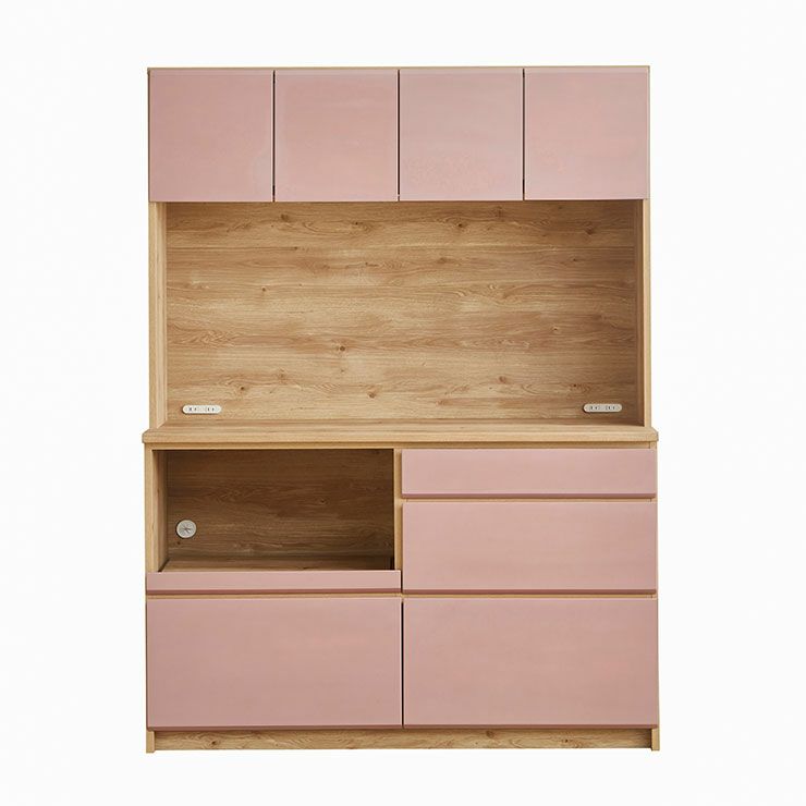 オープンカウンターの内寸高は約67センチ。大型レンジや炭酸水メーカーなどの背が高い家電も余裕で置けます。さらに左右それぞれに2口コンセント付き。配線がゴチャ付かないので家電も効率よく使えます。