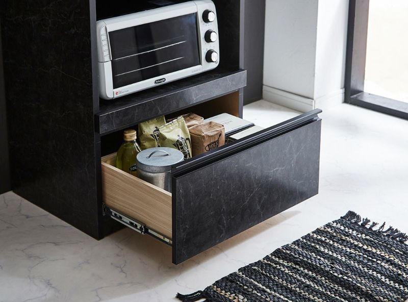 一番下はたっぷり大容量の引出し。頑丈な四方箱組仕上げで壊れにくく、しっかり引き出せるから奥のものまで取り出しやすいフルオープンレール付。保存食からキッチン周りの備品までスッキリ綺麗にまとめちゃいましょう。