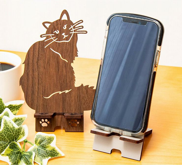 とても可愛らしいブサかわネコのモチーフのスマホスタンドです 。高級感のあるデザインが特徴で、手作りの木製素材が温かみを与え ます。日本製の品質にもこだわり、特に女性の方へのプレゼントにもピ ッタリです