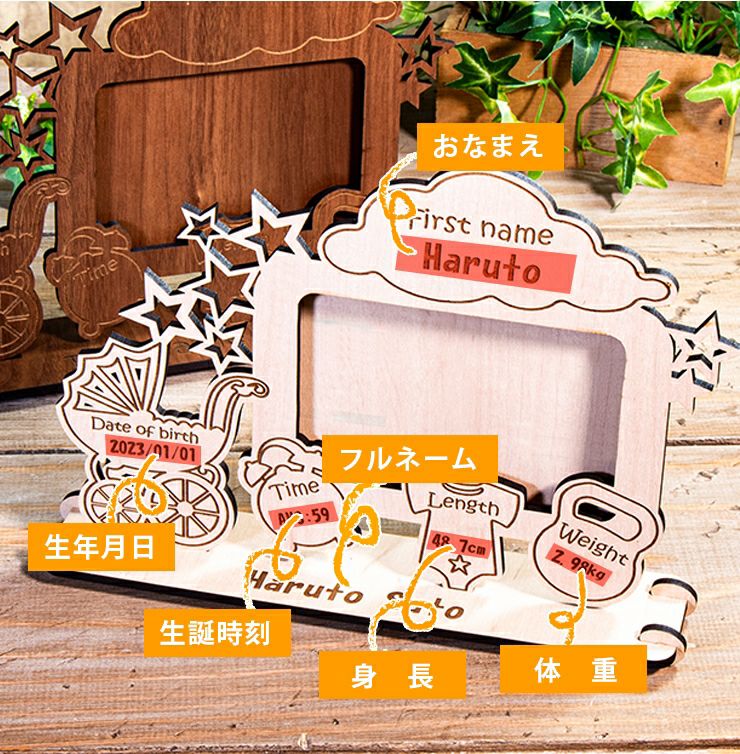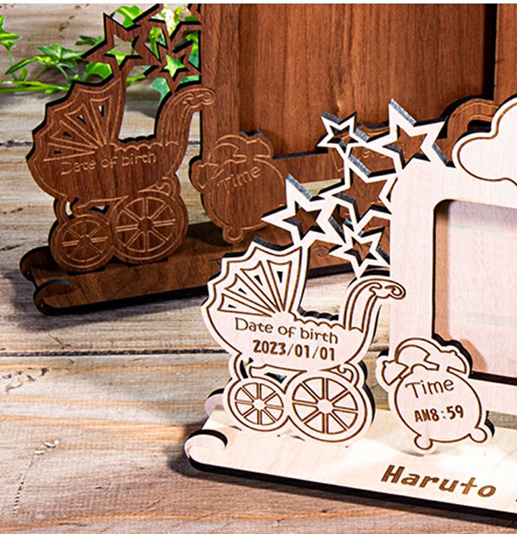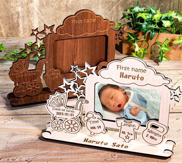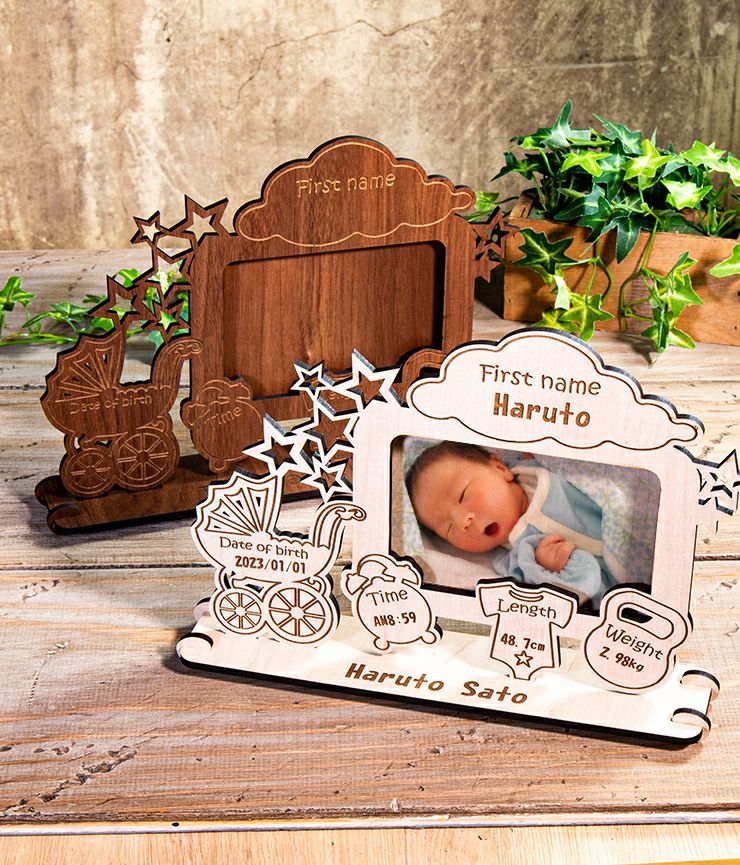 かわいらしいデザインのフォトフレーム!お名前や身長体重、誕生日をレーザー彫刻で名入れができます。思い出の写真と共に、大切な情報を刻んで永久保存しましょう。