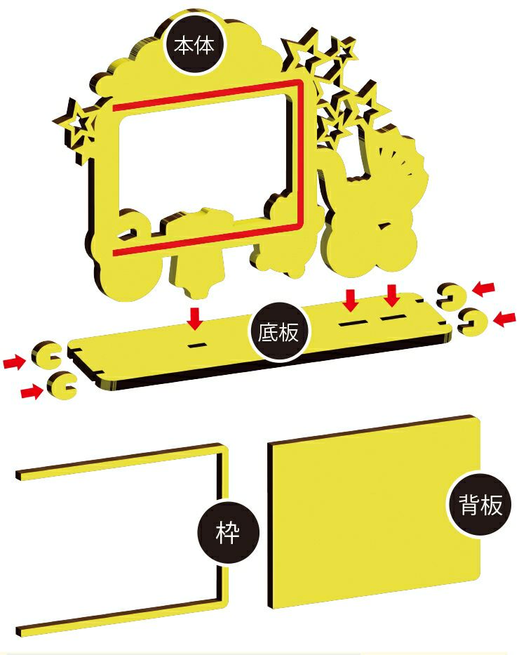 上記の枠の片面にまず木工用ボンドを塗り、本体に接着し、次に枠に合わせて背板を接着(枠側にボンドを塗る)し、底板に取り付けをお願いいたします。※ボンドは空輸できないため、お手数ですがご用意をお願いいたします。