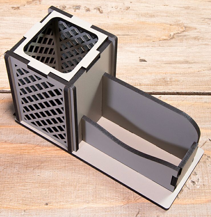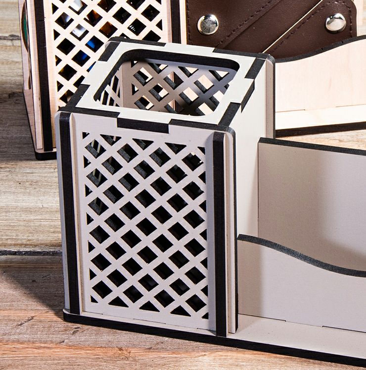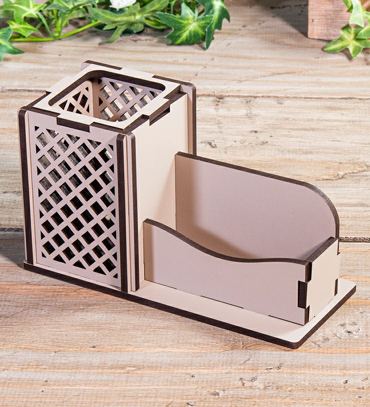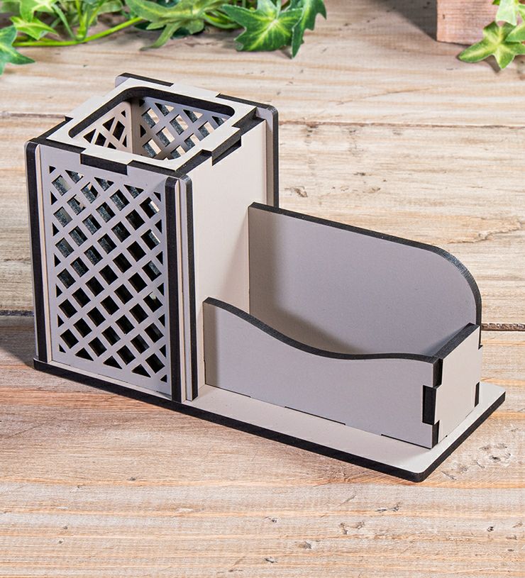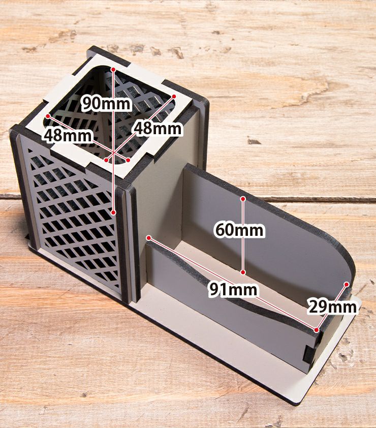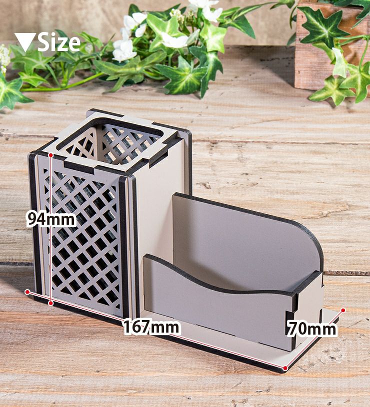 ペンスタンドの4枚の板をかみ合わせ、他のパーツとともに底板に差し込むだけですので、ボンドも工具も不要で簡単にお組み立ていただけます。