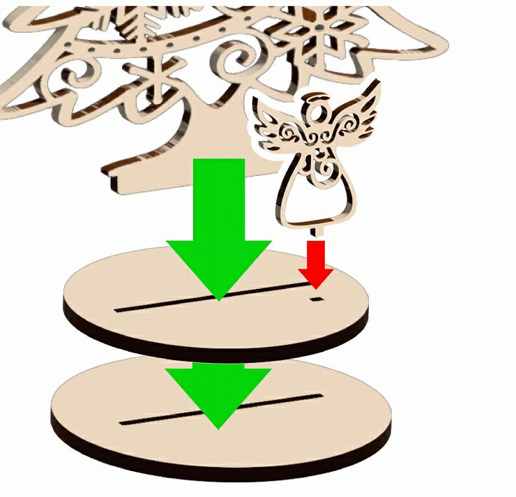 2枚の底板の溝に合わせてツリーを差し込んで、最後に 飾りを差し込むだけでお組み立ては完成です。 工具もボンドも不要です。 解体も引き抜くだけですので 来シーズン以降もご利用いただけます。