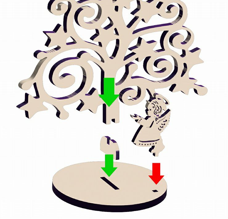 2枚の底板の溝に合わせてツリーを差し込んで、最後に 飾りを差し込むだけでお組み立ては完成です。 工具もボンドも不要です。 解体も引き抜くだけですので 来シーズン以降もご利用いただけます。