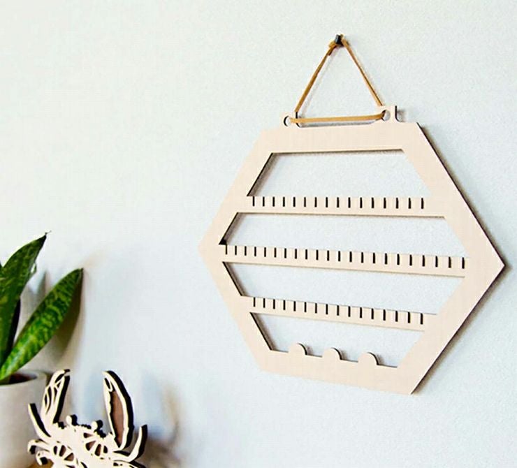 凹凸部分にはピアスやイヤリング、最下段にはネックレスやブレスレットが収納できます。吊り下げ紐も付属しています。