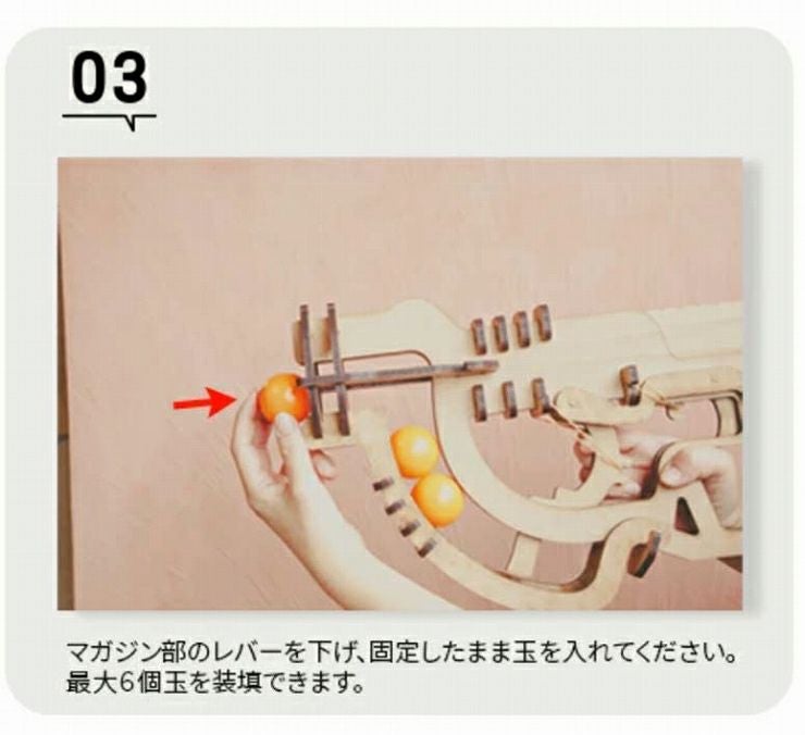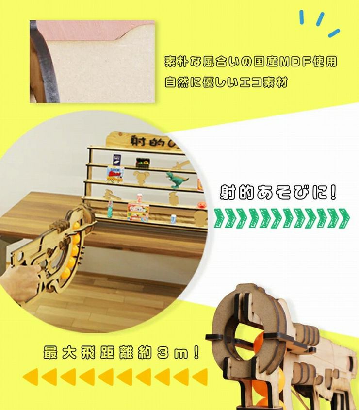 色が塗れる国産MDF使用。好きな色に塗って自分だけの銃が作れる!自由研究にも最適です。 最大飛距離約3m。縁日の射的遊びやイベントの催しにも。