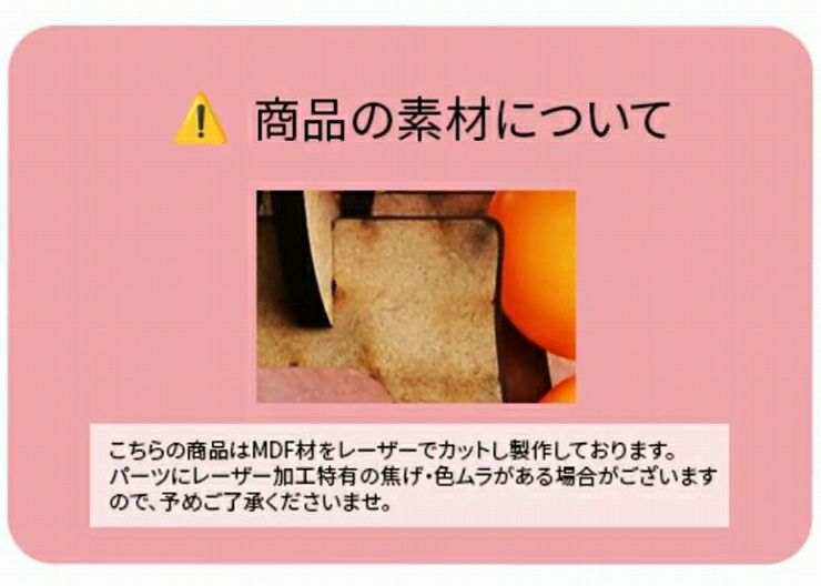 【必要となる工具】 ハンマー、木工用ボンド、ニッパー ※上記の工具・輪ゴムはセットに付属しておりませんので、ご用意をお願いいたします。 ※対象年齢10歳以上 照明やモニターの発色の具合によって、実際の商品とお色味が異なる場合が御座いますので、予めご了承くださいませ。 木製素材のため、木目や色合いの個体差がございます。手作り品の為、製品に個体差がみられます。あらかじめご了承ください。 商品は表面・裏面、共に焦げがついている商品となります。レーザー加工時特有の焦げむらとなりますので、アンティーク感をお楽しみくださいませ 食べ物ではございません。お子様やペット等の口に入れるなど誤飲にご注意くださいませ。