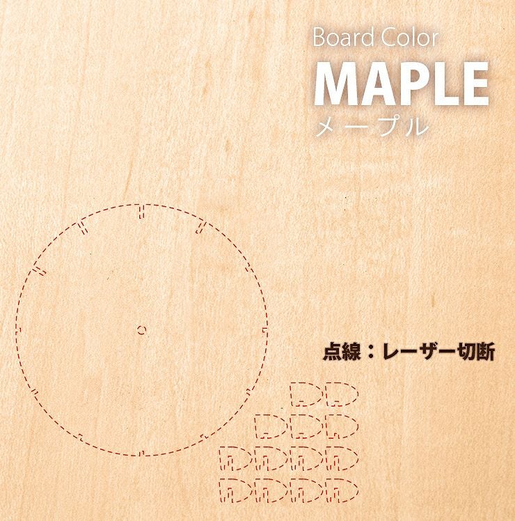 厚さ4mmのMDF材2枚重ねの特殊構造は、時計にボリューム感と立体的な質感、強度をもたらします。視覚的な魅力と組み立て時の楽しさが魅力です。