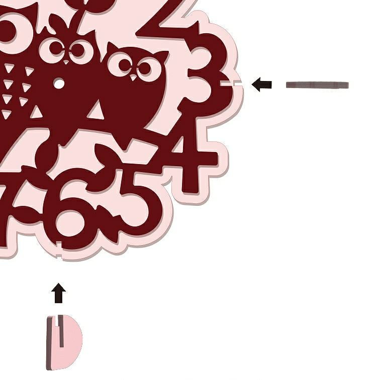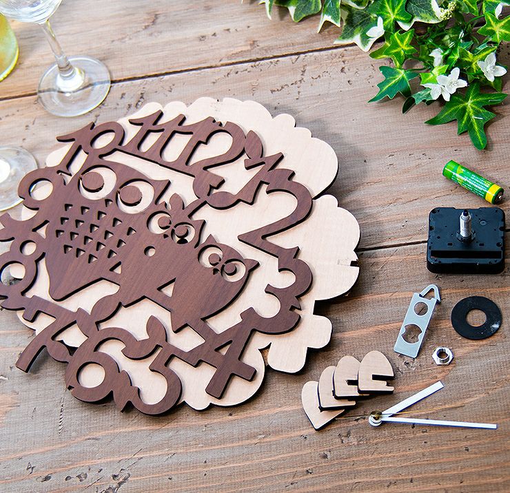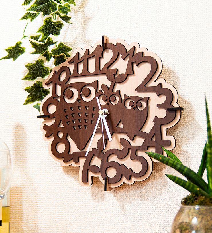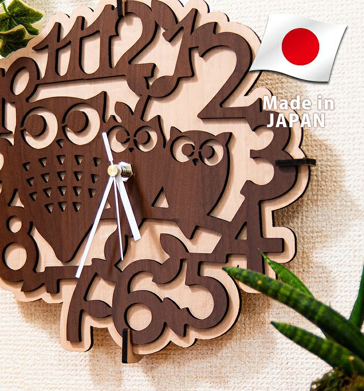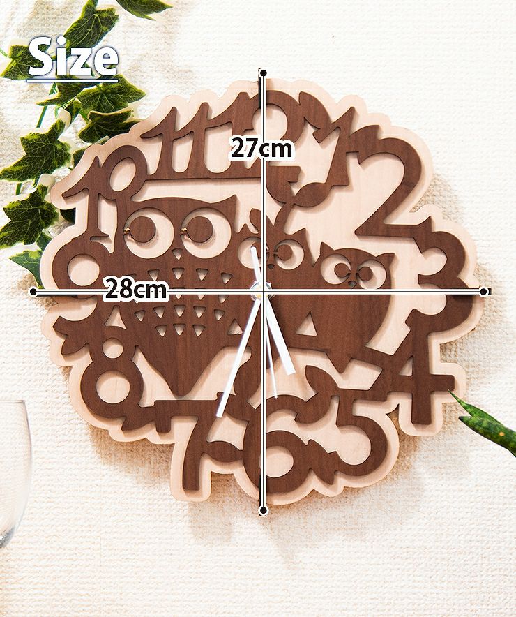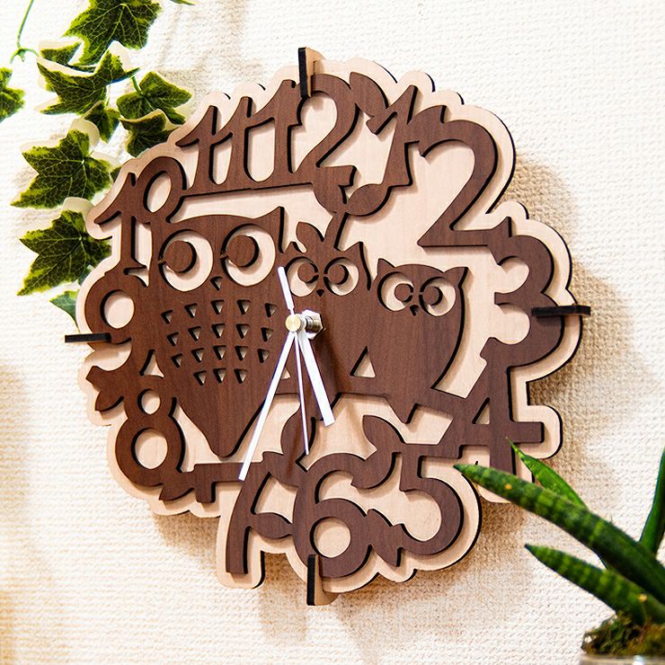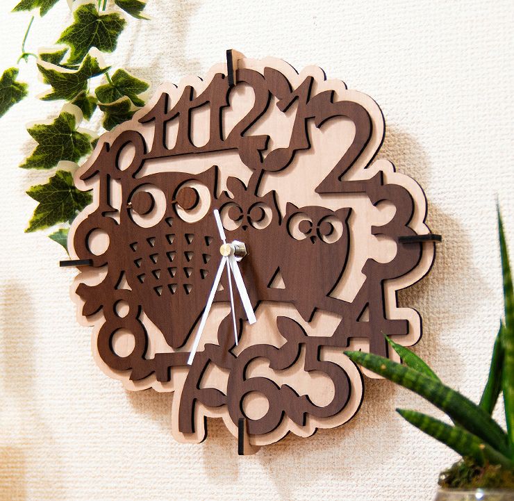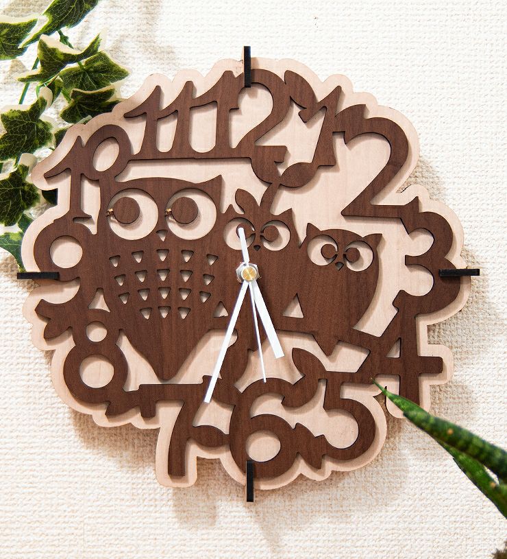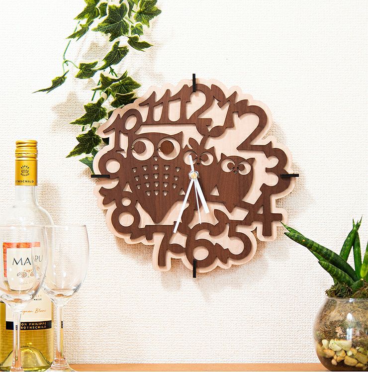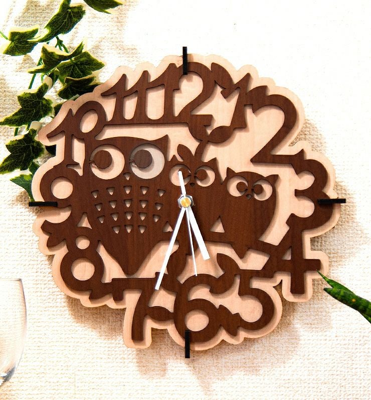 木製壁掛け時計 フクロウたち動物 ウォールクロック 壁時計 約28cm幅 アジアンテイスト おしゃれ 据え置き ウォールナット メープル 国産MDF おしゃれ 国産 北欧雑貨 まとめ買い 組み立て レーザー加工 雑貨
