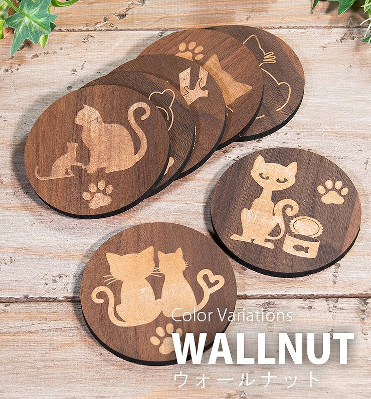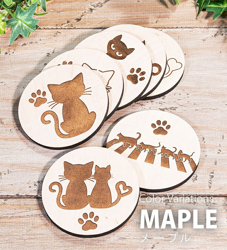 7種から選べるデザイン 木製コースター 4枚セット 9cm×9cm メープル ウォールナット 4.0mm厚の丈夫な国産MDF