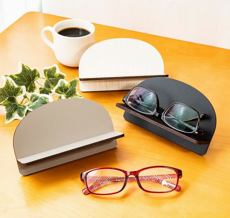メガネスタンドを使用することで、ベッドサイドテーブルの上やリビング、デスクの上などにきちんと保管することができます。また、テーブルや棚に放置するよりも、スタンドに立てておくことで、キズや汚れを予防させることができます。