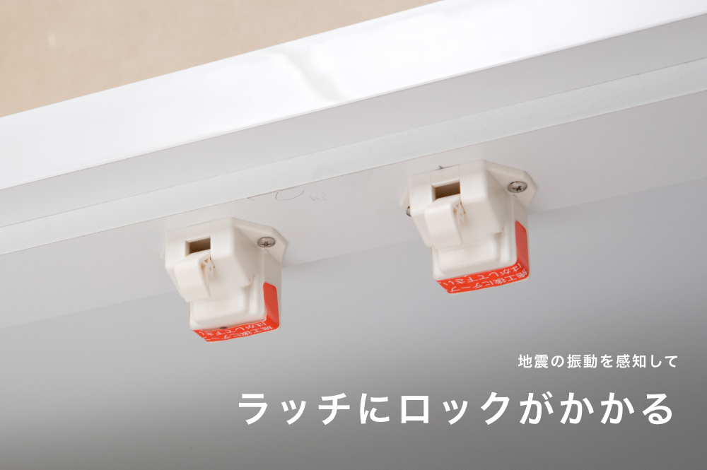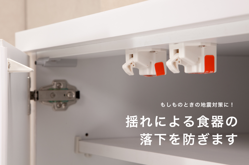耐震ラッチは、一定以上の揺れを感じると、扉が開かないようにロックがかかり、食器などが落下する危険性を抑えます。