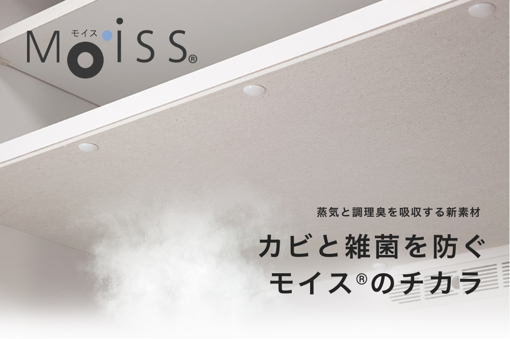 「モイス」は家電から放出される蒸気を素早く吸収して家具にあたるのを防ぎ、同時に熱を遮断し、庫内に残った湿気も吸い取ります。また、衣類収納家具においても余分な湿気や臭いを吸収してくれる効果があります。さらに湿度変化が落ち着くと、今度は吸収した湿気を空気中に放散します。そのため家具自体に蒸気が触れることがすくなくなりカビや雑菌が繁殖しやすい環境を作らないと同時に、急激な熱変化もおさえることができるため、家具が長持ちするようになるのです。実際にモイスは家具だけでなく家の内装材にも用いられる、大変優れた調湿素材です。