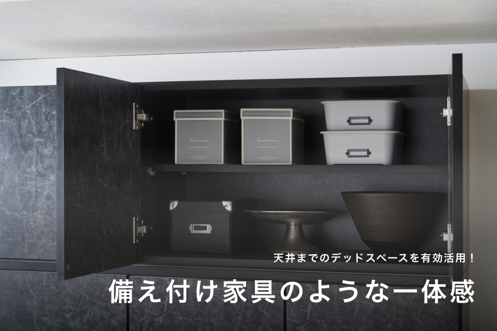 上置きを追加することで、そのデッドスペースを収納スペースとして有効活用でき、さらに備え付け家具のような一体感を出すことができます!!
