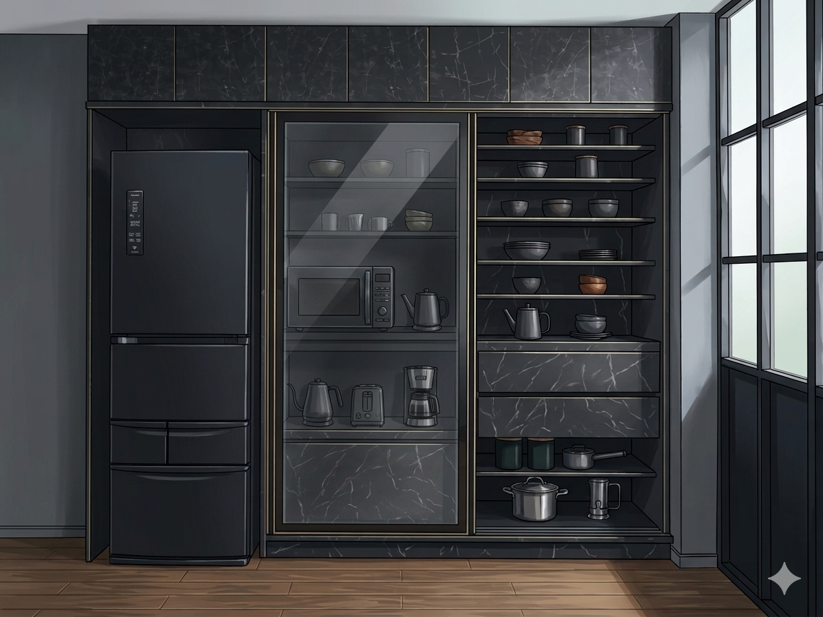 今の食器棚には、食器だけではなく、カトラリー、ラップ、保存袋、電子レンジ、炊飯器、トースター、ケトル、お米、缶詰、飲料ストック、ゴミ箱、子どものコップや水筒、季節家電まで集まります。つまり今の食器棚は、キッチン背面の生活そのものをまとめる家具です。