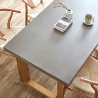 引越しに合わせて購入しました。 脚の色がナラの床材と馴染んでとても気に入りました。 天板の厚みも重厚感があり、子供がスプーン等でトントン叩いても凹むことなく、綺麗に使えています。 友人から値段を聞かれて応えると驚かれます。 組立サービスを利用したのですが、組立をしてくれた方の対応もよく、商品共に大満足です。
